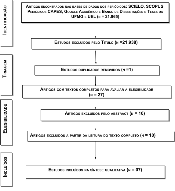 Desse modo, foram selecionados sete artigos sendo incluídos segundo os critérios de    elegibilidade conforme a Figura 1. fluxograma e critérios de seleção e inclusão dos trabalhos.  Neste caso, os critérios de inclusão foram: artigos nos idiomas  inglês, espanhol e português, nos últimos quinze anos, envolvendo as contribuições dos estudos semióticos para compreensão de significados e superação das dificuldades de estudantes nas representações simbólicas científicas: uma revisão. Foram ainda excluídos os capítulos de livro, resumos de eventos, relatos de caso, editoriais, revisões sistemáticas, meta-análises e artigos de opinião.