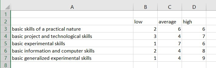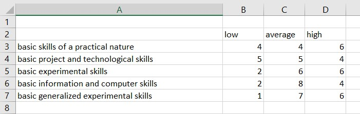 In order to objectively evaluate the effectiveness of the cooperation of teachers and students involved in joint project activities, we will analyze the dynamics of the levels of formation of the skills of schoolchildren. To do this, we will consider the results that were obtained before the implementation of the project for a group of elementary school students (12 students) in inclusive education which can be find in tab. 1 and at the Fig. 7.