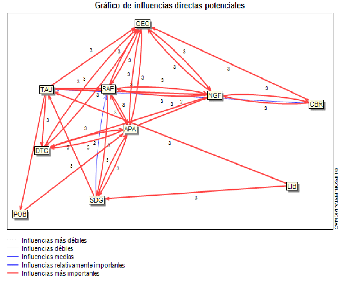 Una vez determinadas estas tendencias, se analizaron bajo el método de Matriz de Impactos Cruzados Multiplicación Aplicada a la Clasificación (MICMAC), en particular con la matriz de influencias directas potencias (MIDP) la cual arrojó que en el corto plazo cuatro tendencias tendrán fuerte influencia sobre las SAAS y son los conflictos geopolíticos por la obtención de los recursos; la competencia por la hegemonía, global; la sofisticación de las amenazas emergentes; y el acelerado proceso de automatización de la vida humana. Cabe señalar que el método MICMAC es una herramienta y programa desarrollado por Michel Godet,[33] para el desarrollo de estudios prospectivos. En esta lógica los datos y ponderaciones con los cuales se alimentó la matriz, fue a partir de la opinión de tres expertos, a los cuales se les preguntó el nivel de influencia que las variables tienen entre sí, siendo el valor de tres como alta influencia; dos, influencia media; uno, influencia baja; y cero, ninguna influencia. Los resultados fueron ingresados al programa el cual desarrolló el gráfico de influencias potenciales, donde se muestran las variables que influirán directamente en el fenómeno estudiado.
