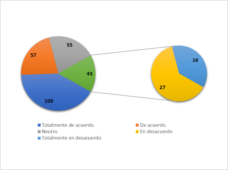 Los resultados evidencian una percepción mayoritaria de insuficiente apoyo y recursos administrativos en la implementación de metodología inclusivas en el aula. Un 65% de los docentes (47% en desacuerdo y 18% totalmente en desacuerdo) manifiesta que no reciben el respaldo adecuado por parte de la administración educativa para llevar a cabo prácticas inclusivas.
