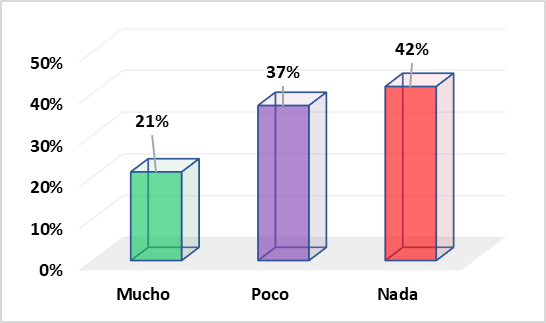 La participación limitada de los docentes en actividades o formaciones que promueven el conocimiento y la implementación de metodologías inclusivas. Un 42% de los docentes no ha participado en estas iniciativas, mientras que el 37% ha participado muy poco, lo que sugiere que solo una minoría de los docentes participa activamente en procesos de formación o actividades que promueven la inclusión en el aula.