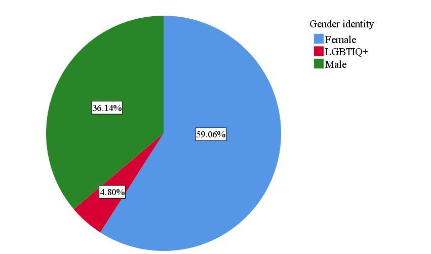 A total of 19,151 undergraduates participated. Regarding self-reported gender identity, 59.0% identified as female (n = 11,316), 36.1% as male (n = 6,914), and 4.8% as LGBTIQ+ (n = 921). Most respondents reported being single (n = 18,397), with fewer in cohabitation (n = 446) or formally married (n = 308) (Table 3). These distributions describe a predominantly single, female-leaning sample with a non-trivial proportion of LGBTIQ+ students.(see Figure 1).
