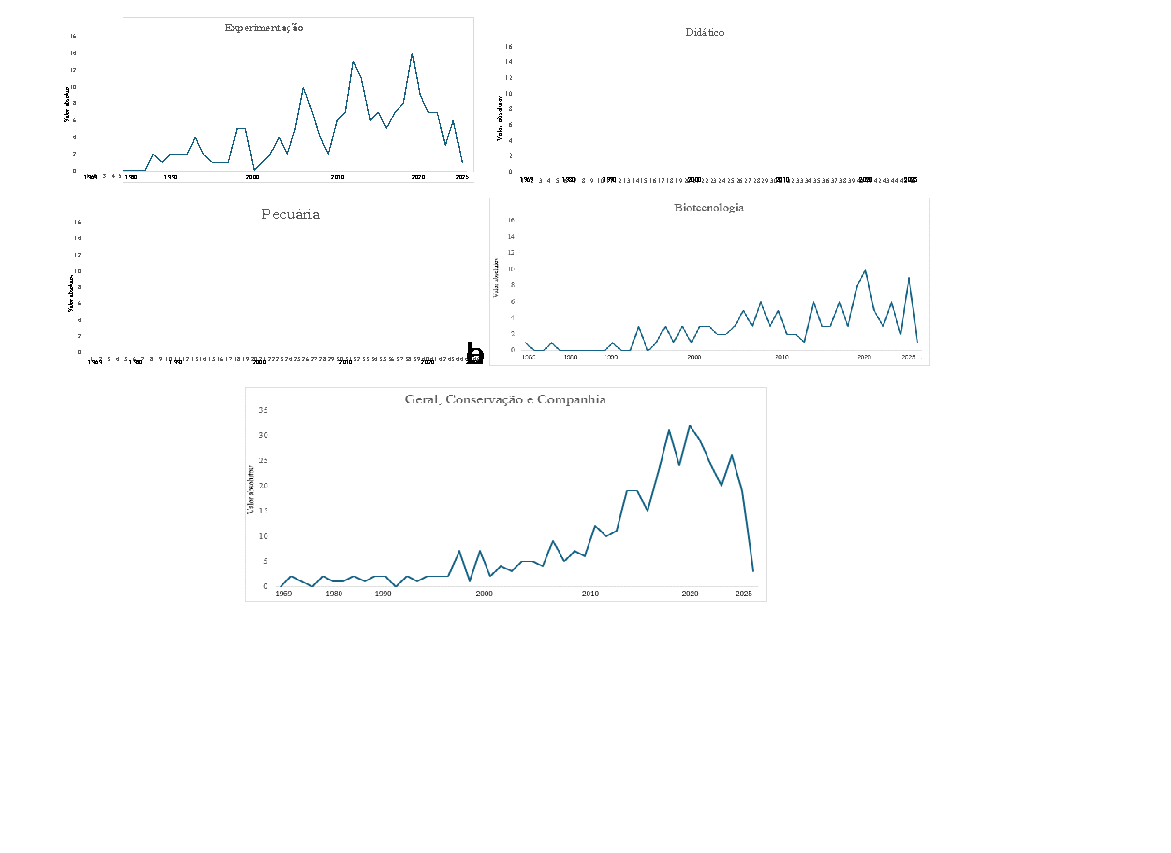 O buscador retornou 4.484 sugestões, das quais 32,7% foram excluídas na primeira seleção, das incluídas, 67,1% foram eliminadas na segunda seleção, sendo que a maioria dos artigos restantes apresentaram como área de abrangência a Filosofia e o Direito (Figura 1). A distribuição temporal demostrou predominância de publicações sobre experimentação e biotecnologia, cujas pesquisas iniciaram em 1969, mantendo-se expressivas so longo do tempo, com pico no fim dos anos 2000 e 2020, possivelmente refletindo demandas de legislações internacionais e enfrentamento da pandemia Covid-19[25]. As produções sobre uso didático e pecuária foram contínuas, sendo que as demais abordagens se acentuaram na última década (Figura 2).